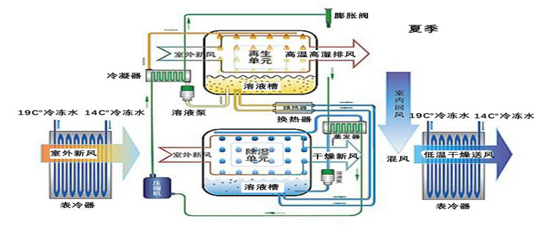 溶液除濕空調系統是基于以除濕溶液為吸濕劑調節空氣濕度,以水為制冷劑調節空氣溫度的主動除濕空氣處理技術而開發的可以提供全新風運行工況的新型空調產品;其核心是利用除濕劑物理特性,通過創新的溶液除濕與再生的方法,實現在露點溫度之上高效除濕。系統溫濕度調節完全在常壓開式氣氛中進行。具有制造簡單,運轉可靠,節能高效等技術特點。
