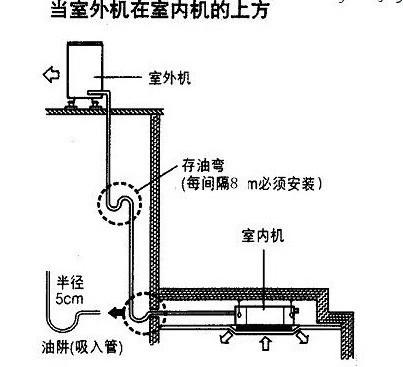 當系統(tǒng)室內外機之間存在落差時,氣管的立管部分從下往上每隔10m 處安裝一個存油彎。