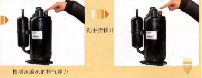 首先,將壓縮機(jī)卸下, 加電使其運(yùn)轉(zhuǎn),用手指堵住壓縮機(jī)的排氣孔片刻, 再將手指移開。 由于壓縮機(jī)內(nèi)有壓力, 所以當(dāng)用手堵住壓縮機(jī)的排氣孔時(shí), 應(yīng)感到有排氣壓力;當(dāng)把手指移開時(shí), 可以聽到 “呲呲的排氣聲, 而且排氣壓力正常的壓縮機(jī),應(yīng)很難堵住壓縮機(jī)排除的氣體,這表明壓縮機(jī)性能良好。如果用手堵住排氣管時(shí)感覺不到壓力, 將手指移開時(shí),聽不到排氣聲, 則說明該壓縮機(jī)性能不良。如下圖所示: