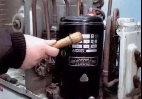 一般選擇木錘或者就地選擇可用物件。在壓機(jī)啟動(dòng)時(shí)重錘敲擊其身上的三個(gè)焊點(diǎn)。但要注意力道,不能敲變形。輕輕地敲擊壓縮機(jī)外殼,把卡住部位稍微振松,有時(shí)可啟動(dòng)運(yùn)轉(zhuǎn)或把電源電壓往上調(diào)高10%,多次啟動(dòng)沖擊,這個(gè)方法可解決潤滑不夠的卡缸現(xiàn)象,對(duì)旋轉(zhuǎn)式壓縮機(jī)特別有效。