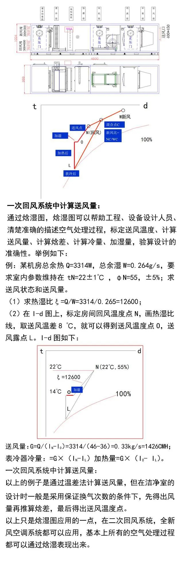 下圖為濕空氣焓濕圖(部分)的示意圖(圖片來源百度百科)。 該圖是以1kg干空氣的濕空氣為基準繪制的。不同大氣壓的焓濕圖是不同的。焓濕圖上有幾種等值參數線:等焓(h)線—與縱坐標成135°角的直線;等含濕量(d)線—平行縱坐標軸的直線;等干球溫度(t)線—近似水平的直線;等相對濕度(Ø)線—圖中的曲線;等濕球溫度線近似與等焓線平行,圖中未表示;水蒸氣分壓力(pw)與d成單值函數關系,其值表示于d的上方,等pw線平行于等d線;圖的右下方給出了熱濕比ε的方向線,熱濕比又稱角系數。