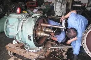 在螺桿壓縮機(jī)必須進(jìn)行大修前,有可能的話,將滑閥卸載到“0”位,正常停機(jī),切斷電源。截?cái)嗯c壓縮機(jī)相連的管路,將壓縮機(jī)內(nèi)的制冷劑和潤(rùn)滑油排出后,方可拆卸壓縮機(jī)。注意拆卸時(shí)要養(yǎng)成好的習(xí)慣,不同部位的零件要分別擺放,并作好必要的裝配標(biāo)記。1、拆下與壓縮機(jī)相連的管路、聯(lián)軸器、地腳螺栓后,將壓縮機(jī)吊運(yùn)至工作場(chǎng)所。最好有操作平臺(tái)。