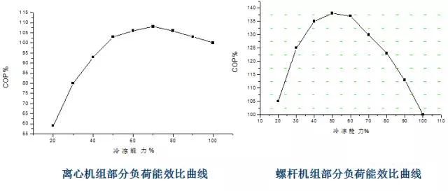 螺桿機(jī)組 :廠家的RSW-1000-4機(jī)組為例,機(jī)組滿負(fù)荷COP為5.24。機(jī)組在75%、50%、25%負(fù)荷下COP分別為6.63、7.23、6.03。