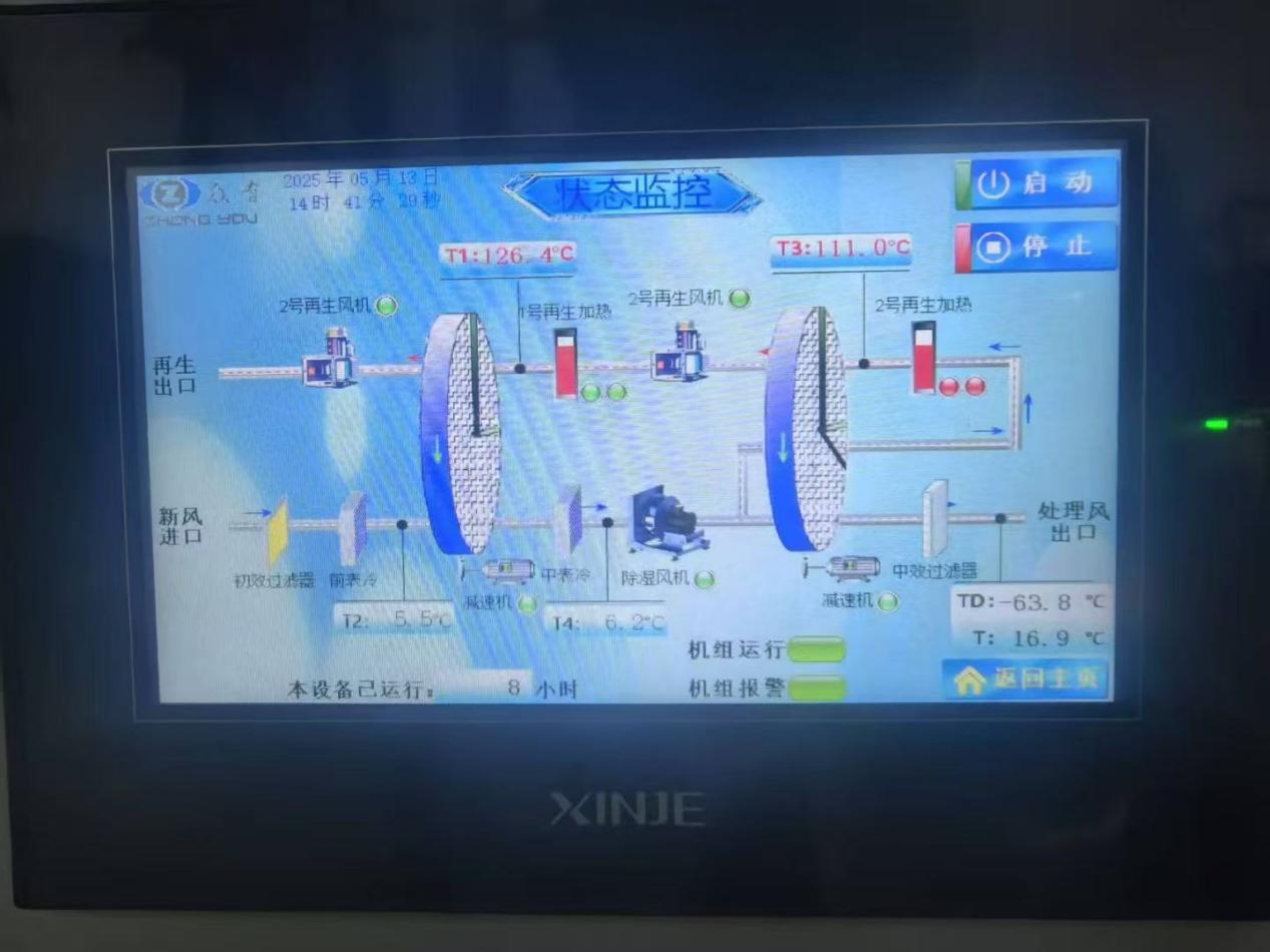 針對嵐圖的技術需求,眾有研發團隊創新采用三級除濕工藝:首級預冷除濕將空氣含濕量降低60%,二級轉輪吸附實現-45℃露點深度脫水,三級冷凝強化確保最終露點穩定在-64.2℃。其中,核心部件蜂窩硅膠轉輪采用納米級疏水涂層技術,吸附效率較傳統材料提升40%;再生系統搭載智能變頻加熱模塊,能耗較行業平均水平降低25%。該設備在20℃/60%RH工況下,除濕量達400L/h,溫濕度波動范圍±0.3℃/±3%RH,綜合性能指標優異。