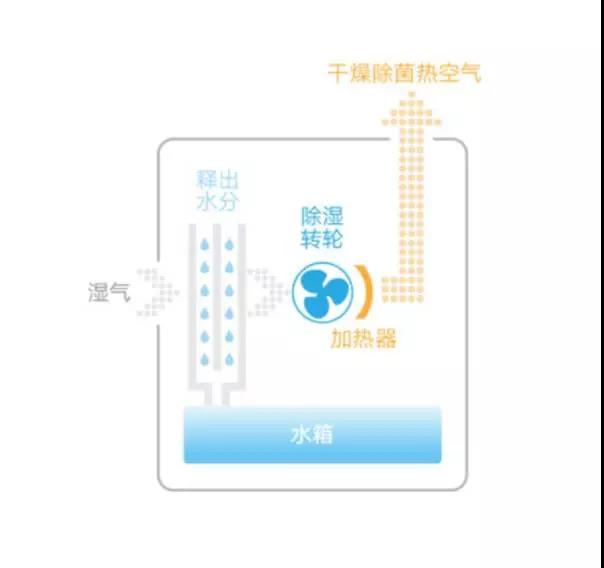 除濕機啟動后會主動吸入潮濕的空氣,然后把空氣加熱至150℃,使得空氣中的水分都變成了水蒸氣。